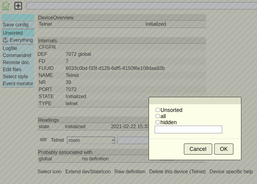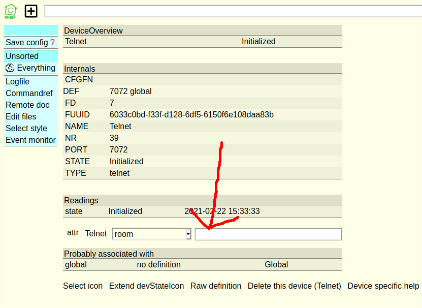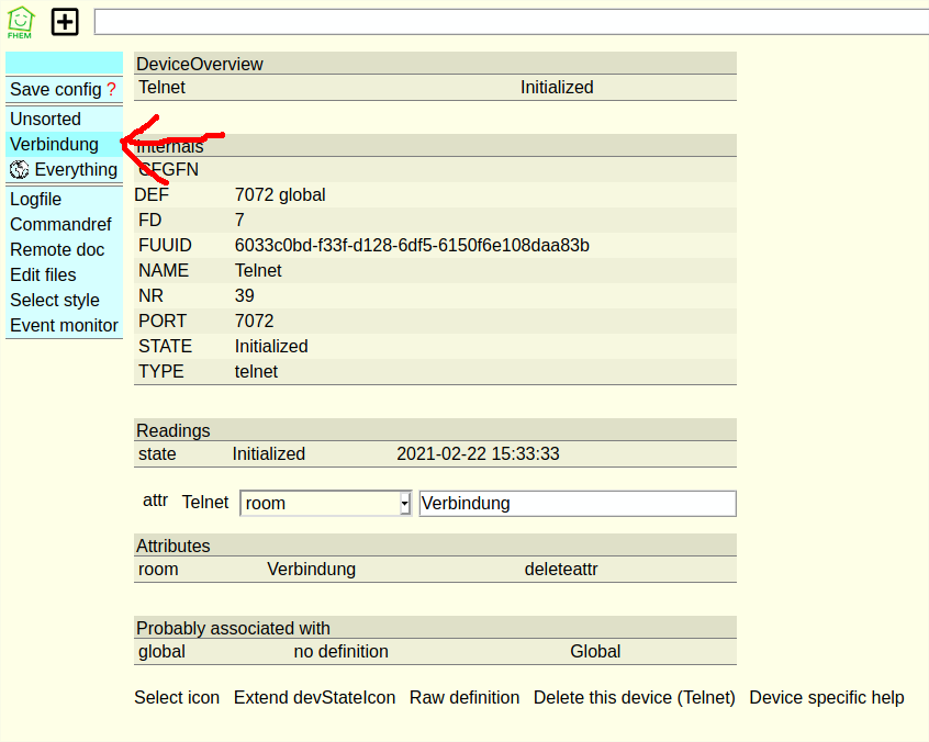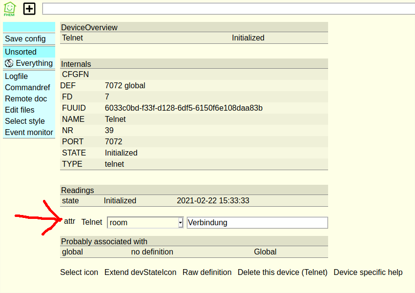 Die Raumzuordnung ist als Attribut in jedem Modul hinterlegt. Hier das Telnet Modul: