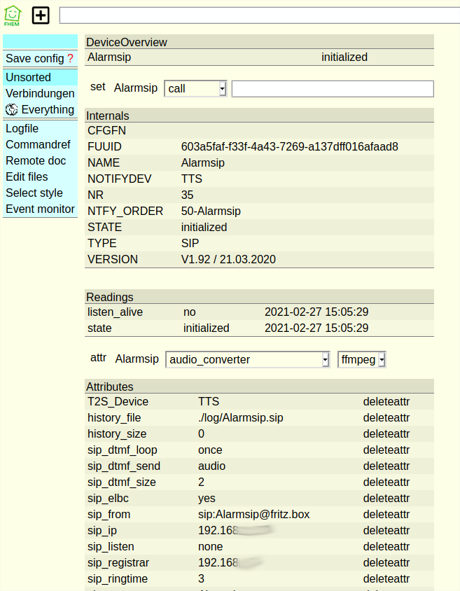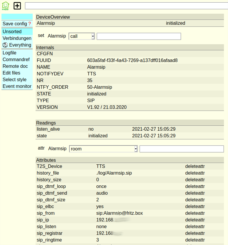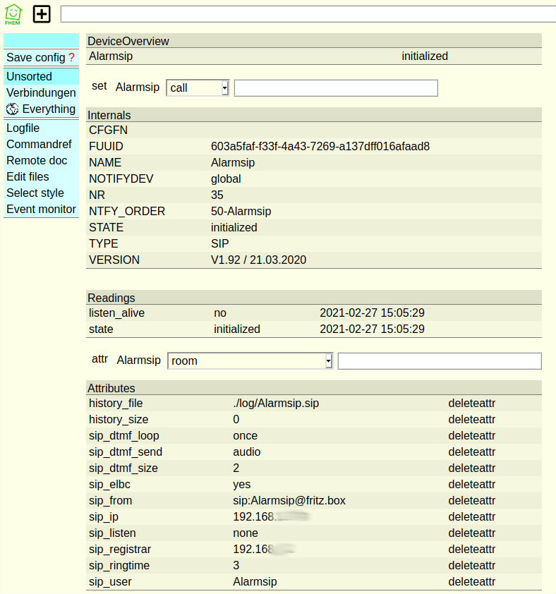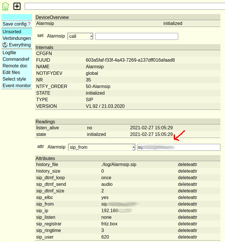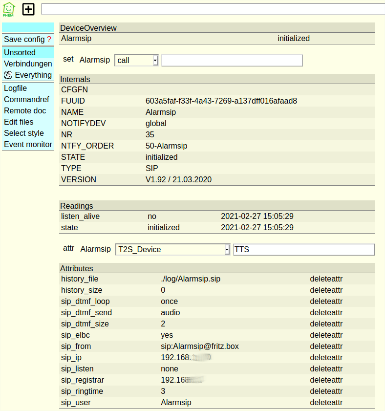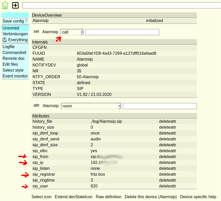 Und so läuft der Test! Gebt oben in die Eingabeleiste neben "set Alarmsip call" folgendes ein: